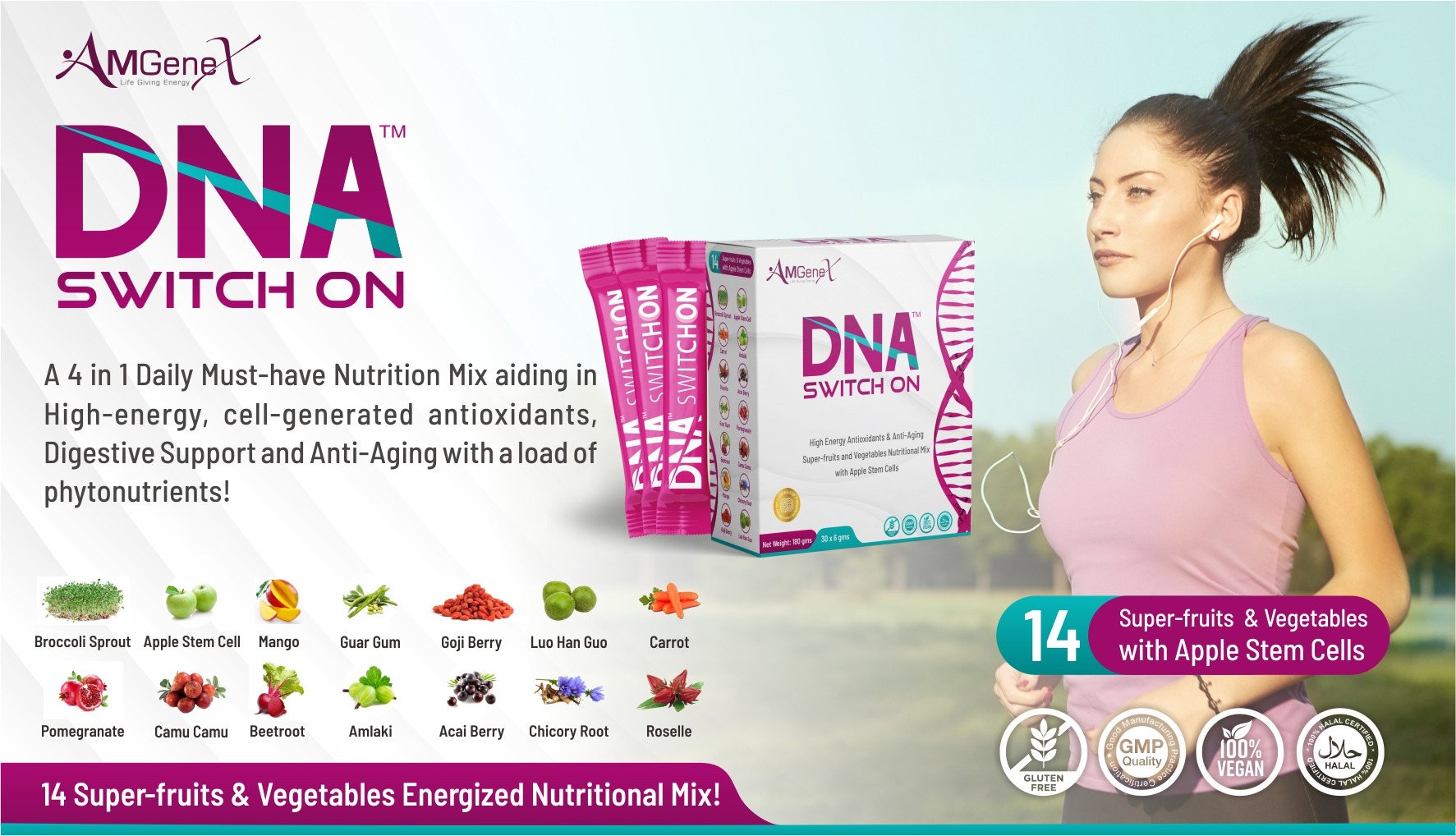 DNA Switch On (Dynamic Nutrition Advantage) is the major breakthrough in modern Nutritional Science, based on the science of Epigenetics and Nutrigenomics. It is blended with 14 world's Best Super Fruits and Vegetables including Broccoli Sprout and Apple Stem cells to boost the cell-generated Glutathione production.